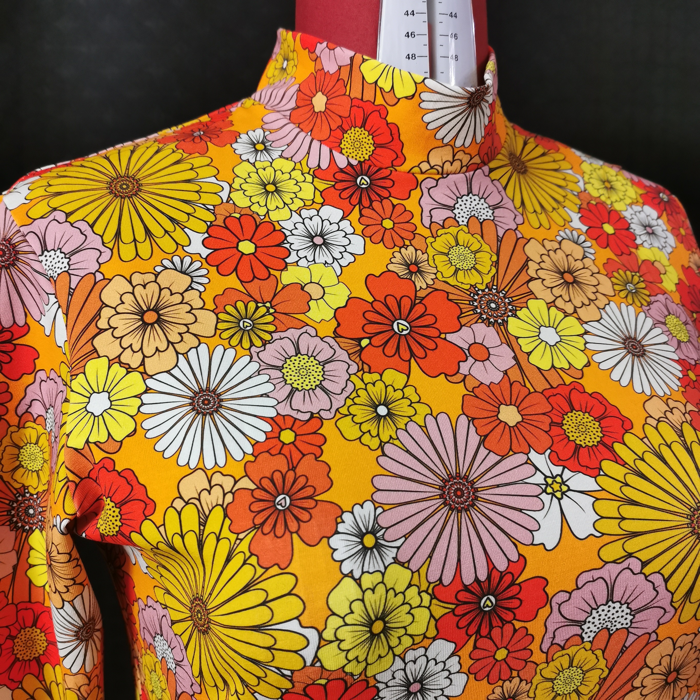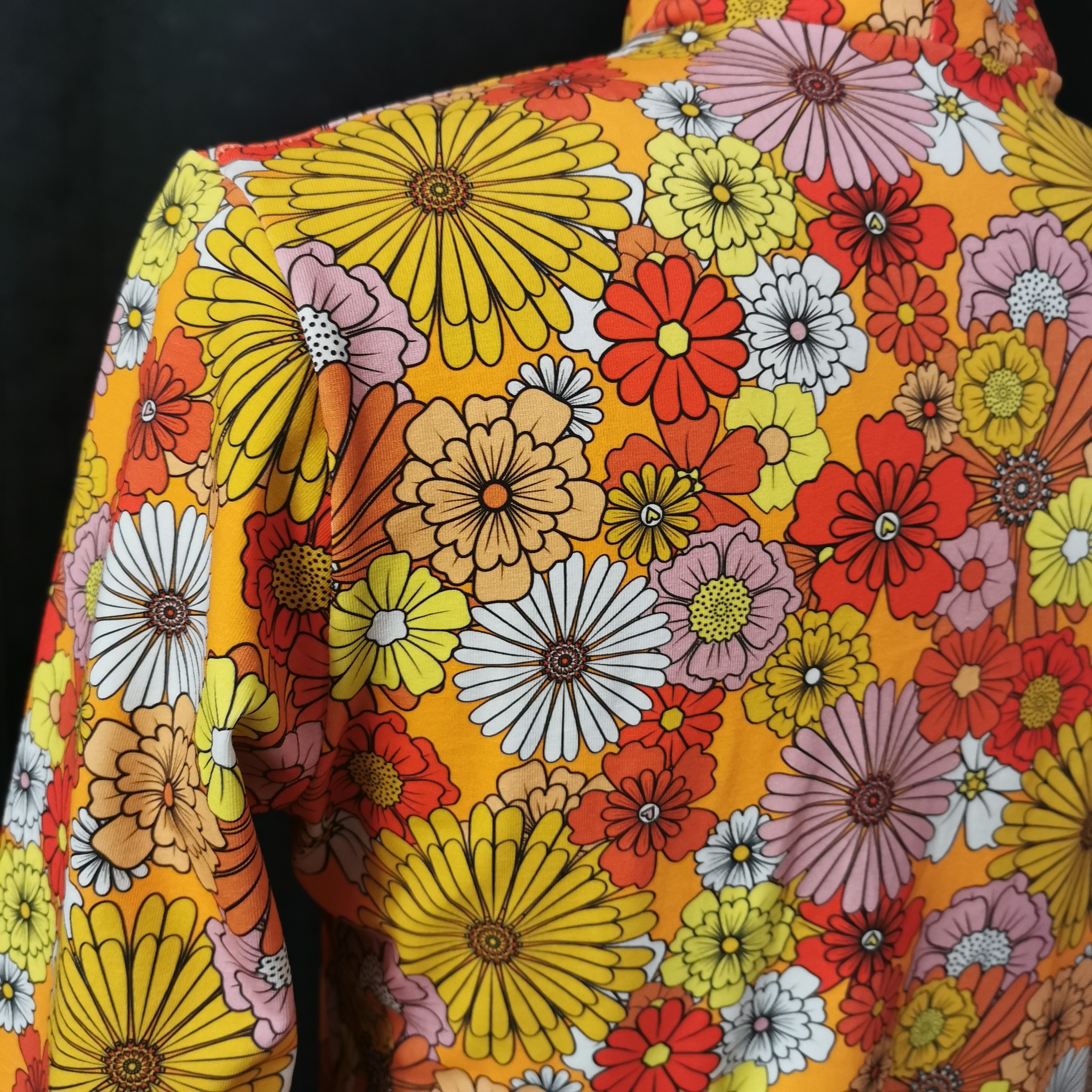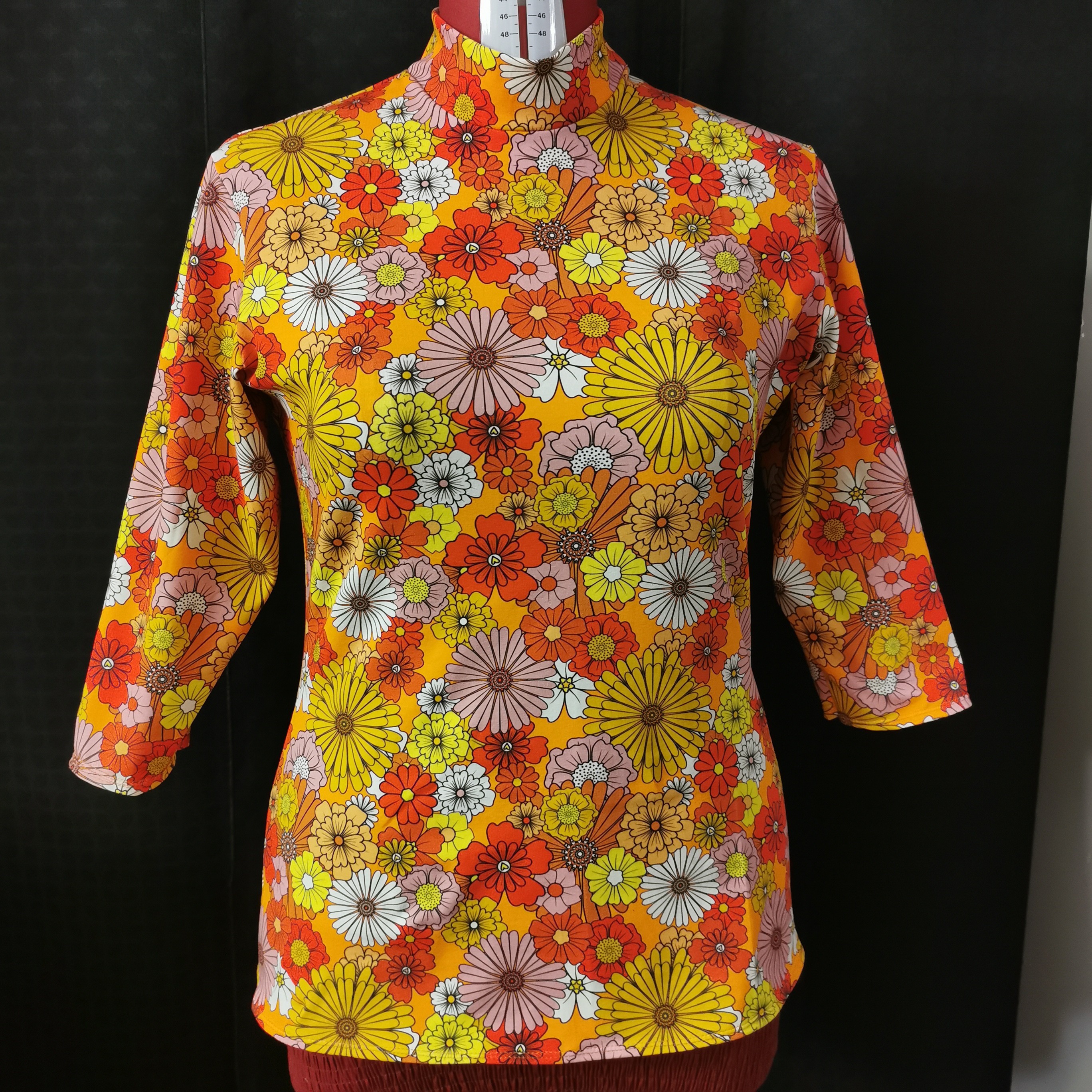 Col montant en jersey certifié Okeo-tex, tissu fleuri à dominante orange créé en France. Manche 3/4 et coupe ajustée. Le tissu souple et extensible en fait un haut confortable, coloré et adapté à toutes les morphologies. Disponible du 34 au 48 comptez 10 jours entre la commande et la livraison. Chaque pièce étant fabriquée uniquement pour vous, n'oubliez pas de mentionner la taille voulue dans les commentaires à la validation de votre commande.