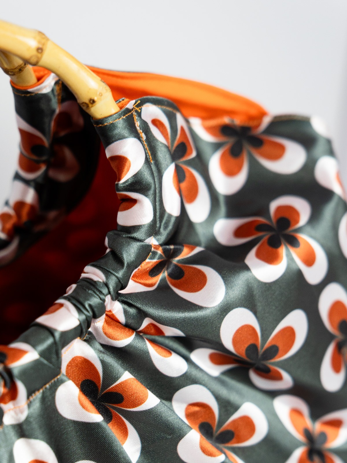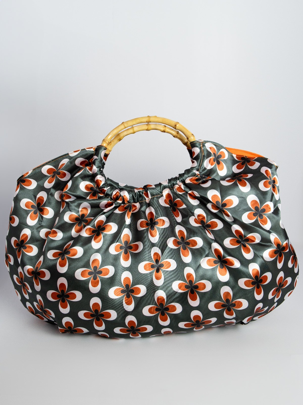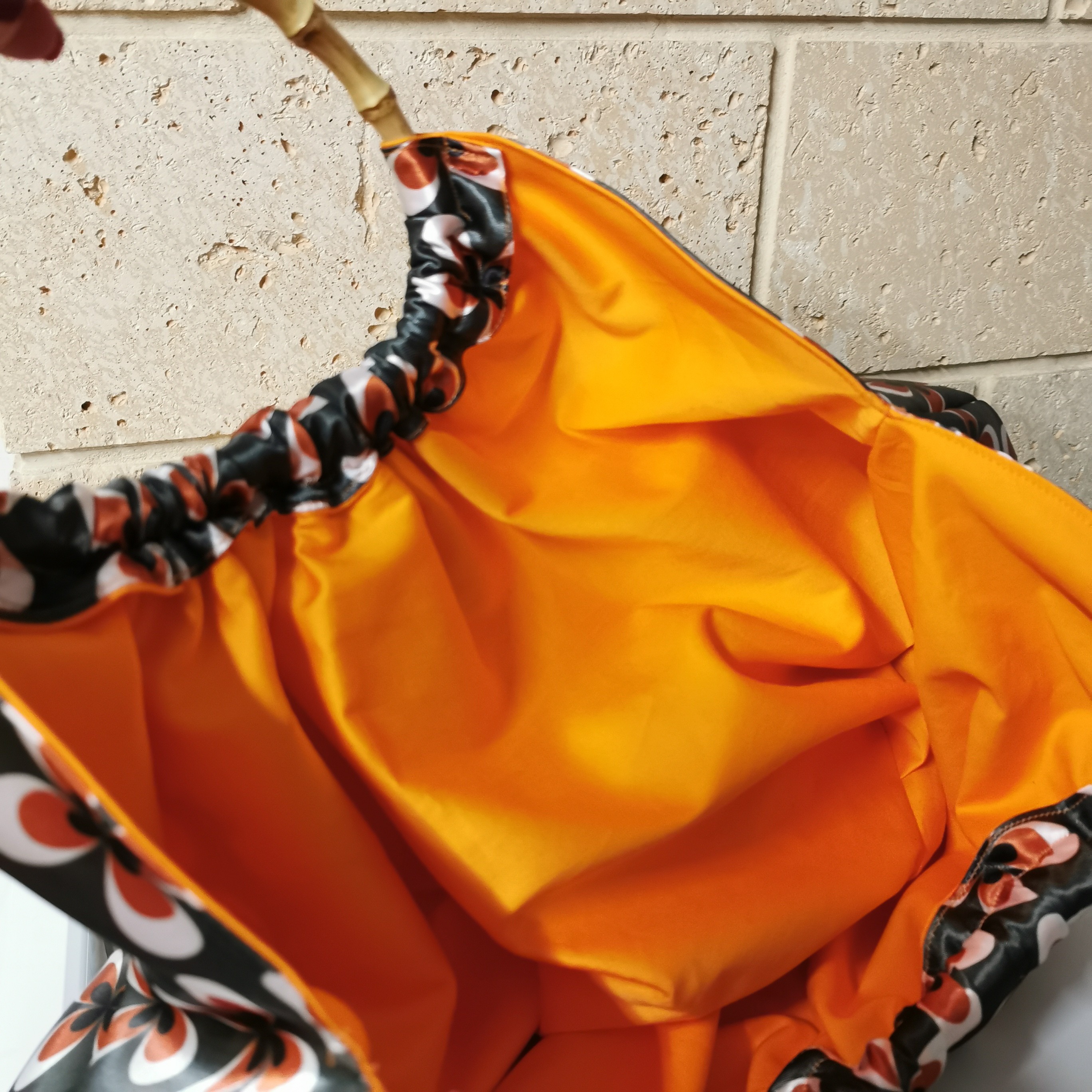 Sac Kababag, profond avec son motif années 70 et sa doublure orange, il dispose d'une petite poche plaquée à l'intérieur et de grandes anses en bambou. Le tissu extérieur est déperlant pour un meilleur entretien.