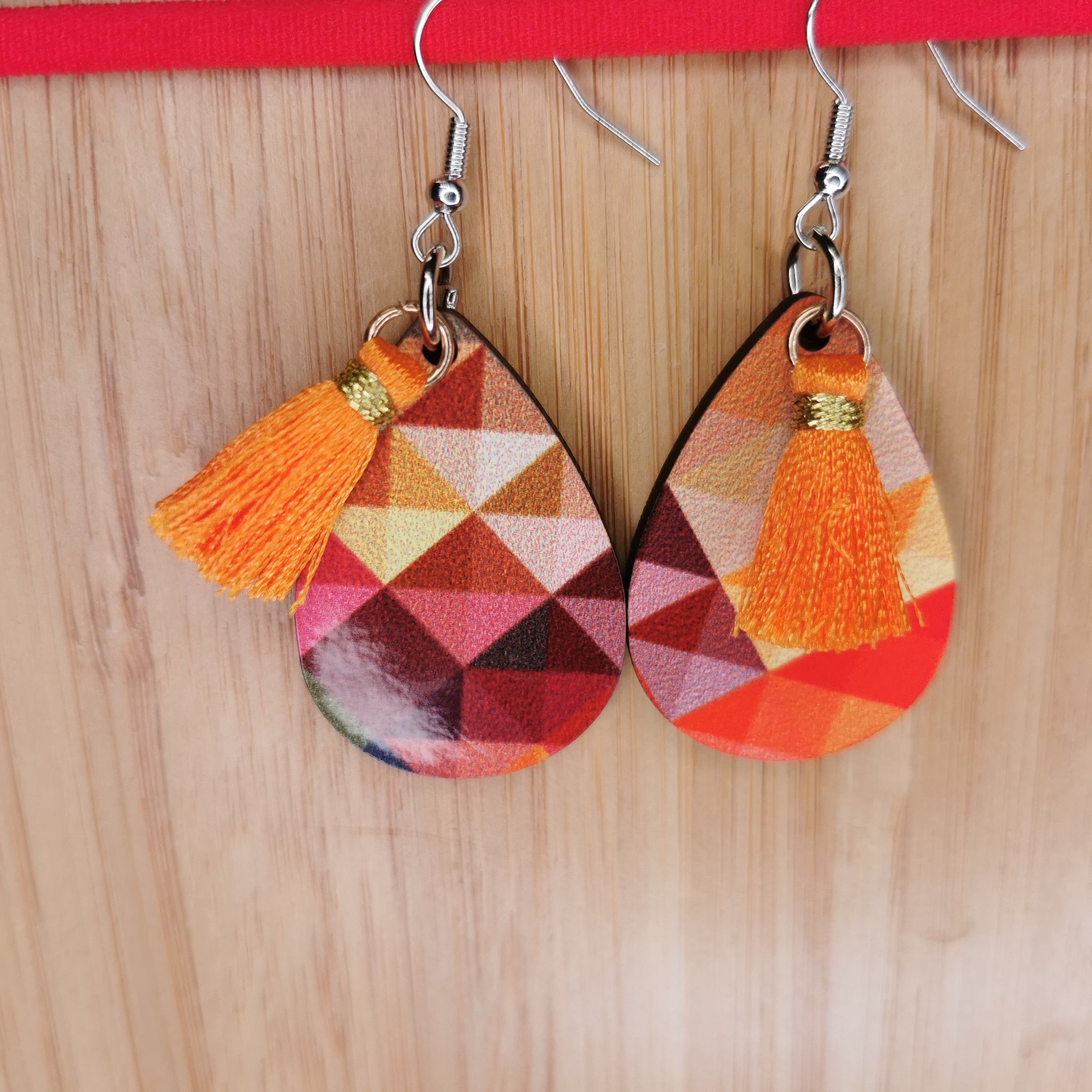 Boucle d'oreilles en bois, motifs géométriques rétro 80 camaïeu oranges/roses. Acier inoxydable et petit pompon assorti.