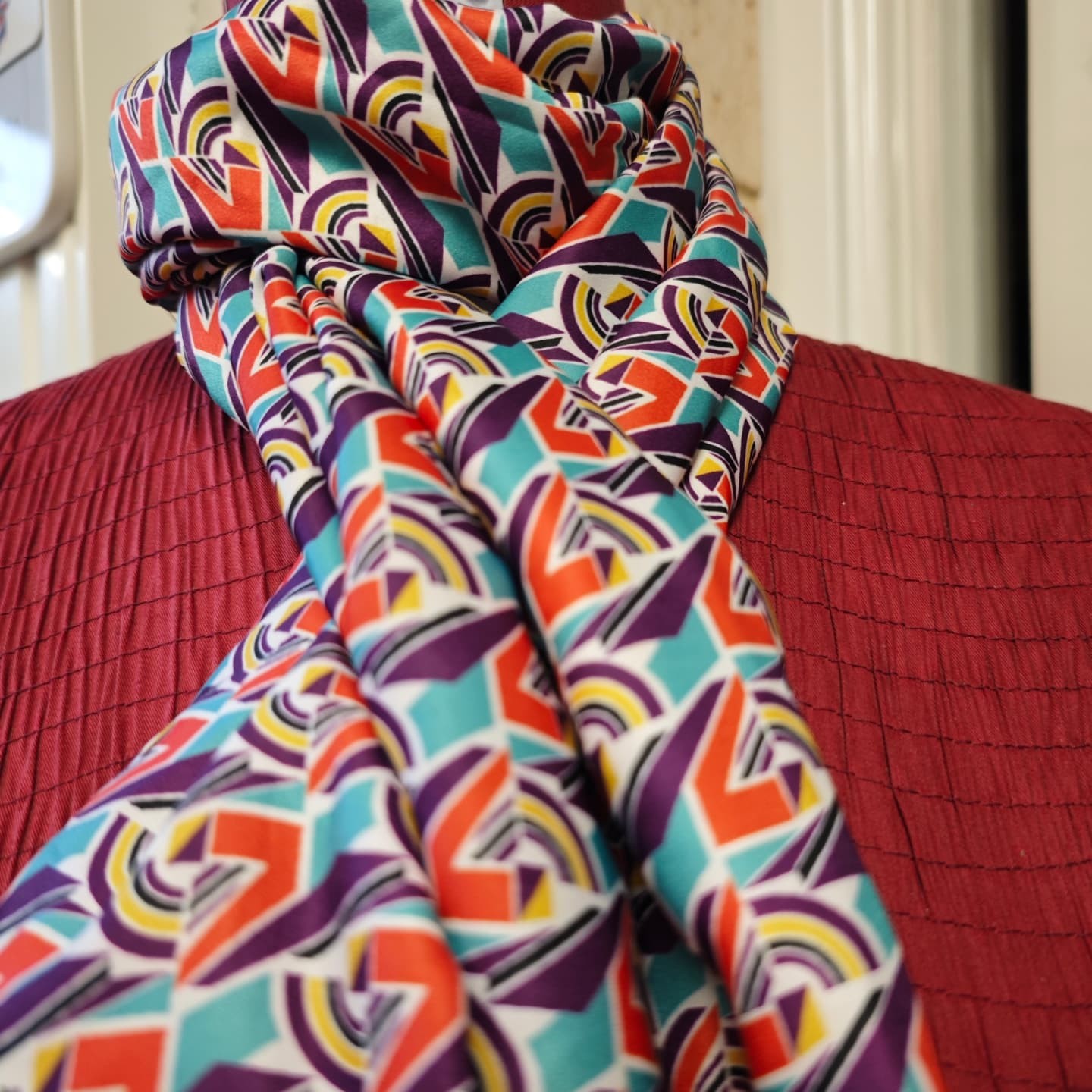 Foulard long/écharpe en satin à l'imprimé directement inspiré des tenues d'hôtesse de l'air des années 60, le compagnon idéal de ce début d'hiver.